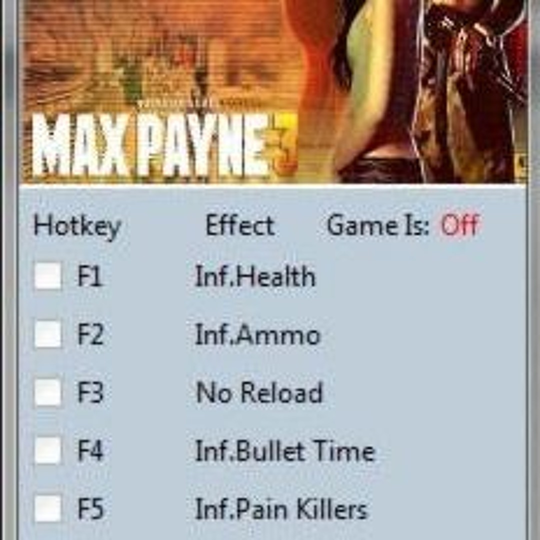 . This trainer may not necessarily work with your copy of the game. Trainers For Max Payne 3 [1.0.0.55] {FLiNG} Numpad 1 ~ Infinite Health Numpad 2 ~ Infinite Ammo Numpad 3 ~ No Reload Numpad 4 ~ Infinite Bullet Time Numpad 5 ~ Infinite Painkillers Numpad 0 ~ One Hit Kill Home ~ Disable All Download Trainer Password on archive - trainersforgames [1.0.0.114] {sILeNt HeLLsCrEAm/HoG} Numpad 1 ~ Infinite Health Numpad 2 ~ Unlimited Ammo Numpad 3 ~ No Reload.